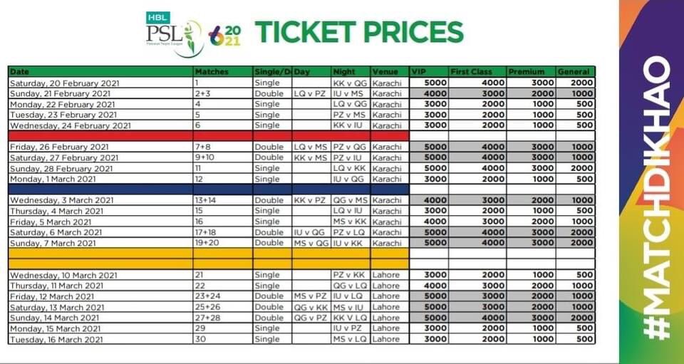 پی ایس ایل سکس کیلئے آن لائن ٹکٹس کی فروخت بدھ کی صبح 10 بجے شروع ہوگی۔ فون کال کے ذریعے بھی ٹکٹ خریدا جاسکے گا۔ افتتاحی میچ کیلیے قیمت 2 سے 5 ہزار روپے جبکہ دوسرے روز کی قیمت ایک سے 4 ہزار روپے تک ہوگی۔ اس کے علاوہ پیر سے بدھ کو ہونے والے میچز کی قیمت 500 سے 3 ہزار تک ہوگی۔