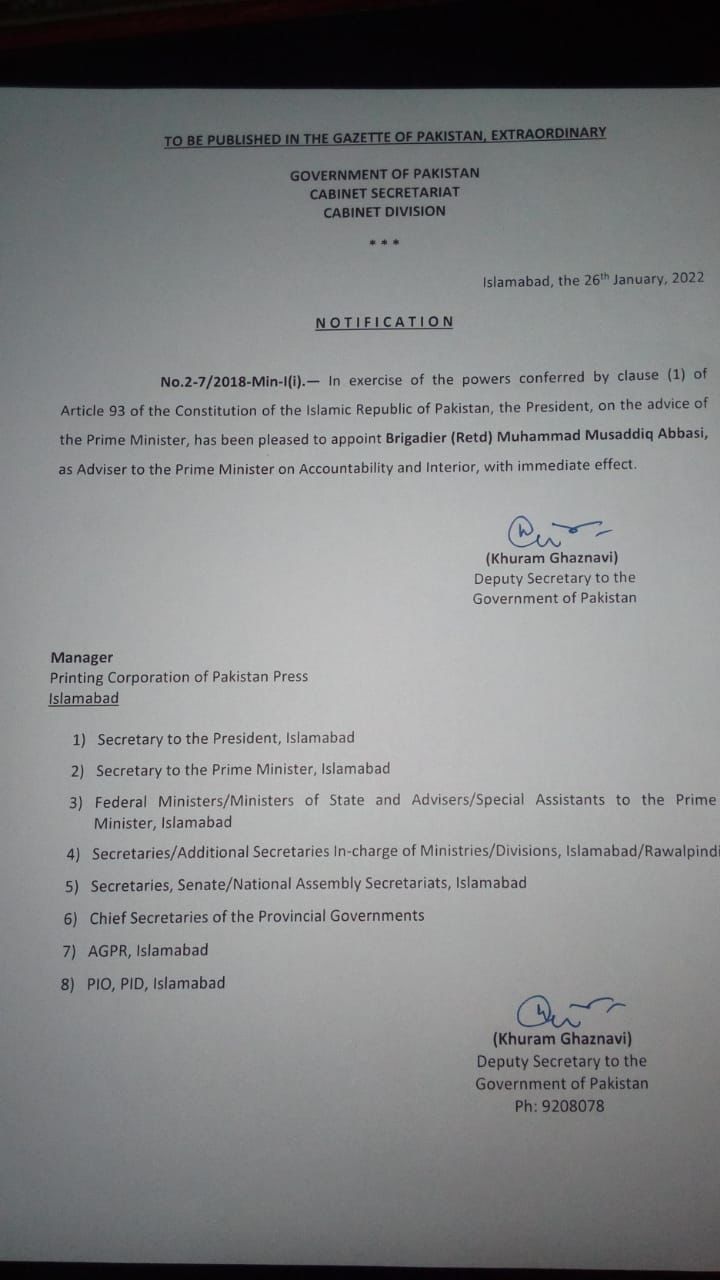 برگیڈیئر ریٹائرڈ مصدق عباسی مشیر برائے داخلہ و احتساب مقرر کرنے کا نوٹیفیکیشن جاری کردیا یے