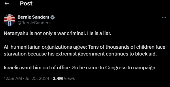 الجزیرہ کی رپورٹ کے مطابق امریکی سینیٹر برنی سینڈرز نے امریکی کانگریس کے مشترکہ اجلاس سے خطاب کے بعد اسرائیلی وزیر اعظم بنجمن نیتن یاہو کو ”جنگی مجرم“ اور ”جھوٹا“ قرار دیا۔