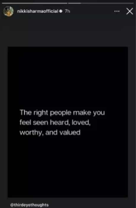 اداکارہ نکی شرما نے انسٹاگرام پر شئیر کردہ ایک اسٹوری میں لکھا کہ ایک صحیح شخص آپ کے احساسات کی قدر کرتے ہوئے آپ کو یہاں حساس دلائے گا کہ آپ خاص ہیں جس سے آپ کو محبت اور اپنی قدر کا مکمل احساس ہوگا۔