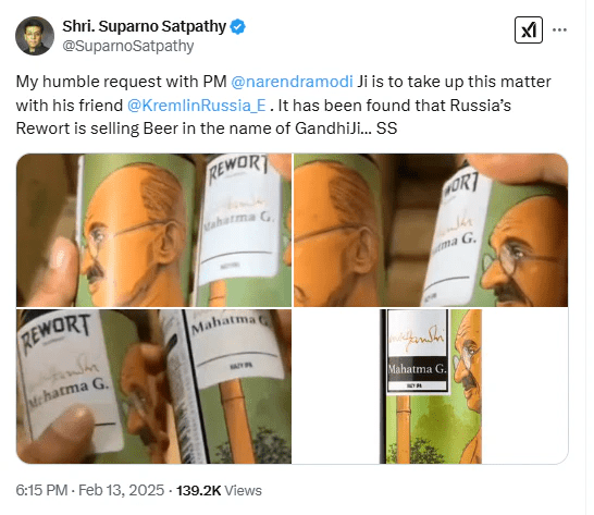 رپورٹ کے مطابق یہ تنازعہ اس وقت شروع ہوا جب اوڈیشہ کے ایک لیڈر سپرنو ستپاتھی نے بیئر کین کی تصویریں شیئر کیں جن پر مہاتما گاندھی کی تصویر دیکھی گئی، یہ شراب کے کین ’ریورٹ‘ نامی برانڈ کے تھے۔