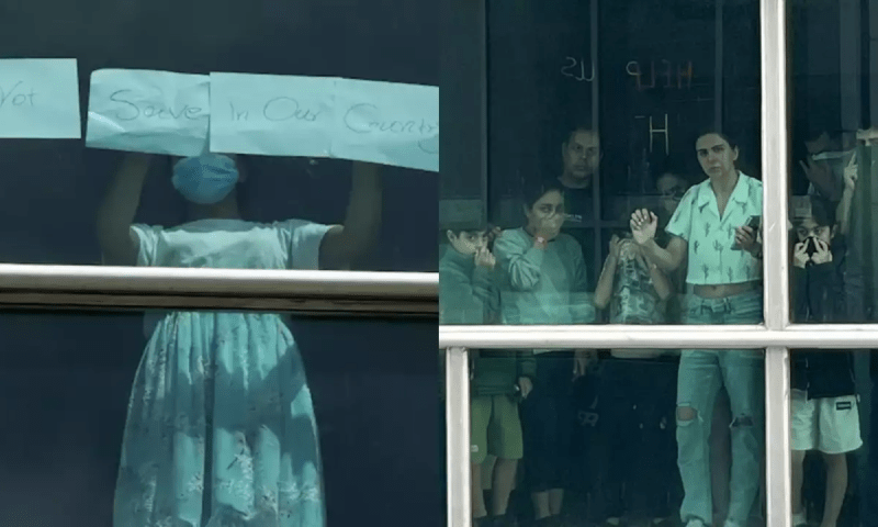 تارکین وطن کی سوشل میڈیا پر وائرل ویڈیوز میں خواتین اور مردوں کو ہوٹل کے کمروں کی کھڑکیوں سے ’ ہماری مدد کریں’ اور ’ ہم اپنے ملک میں محفوظ نہیں’ جیسے پیغامات پلے کارڈز پر لکھ کر لہراتے ہوئے دیکھا گیا۔
