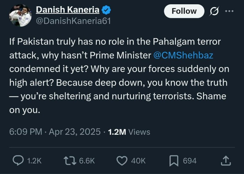 دانش کنیریا نے پہلگام حملے کے بعد متنازع ٹوئٹ میں کہا کہ اگر پاکستان اس حملے میں ملوث نہیں تو وزیراعظم نے ابھی تک مذمت کیوں نہیں کی؟