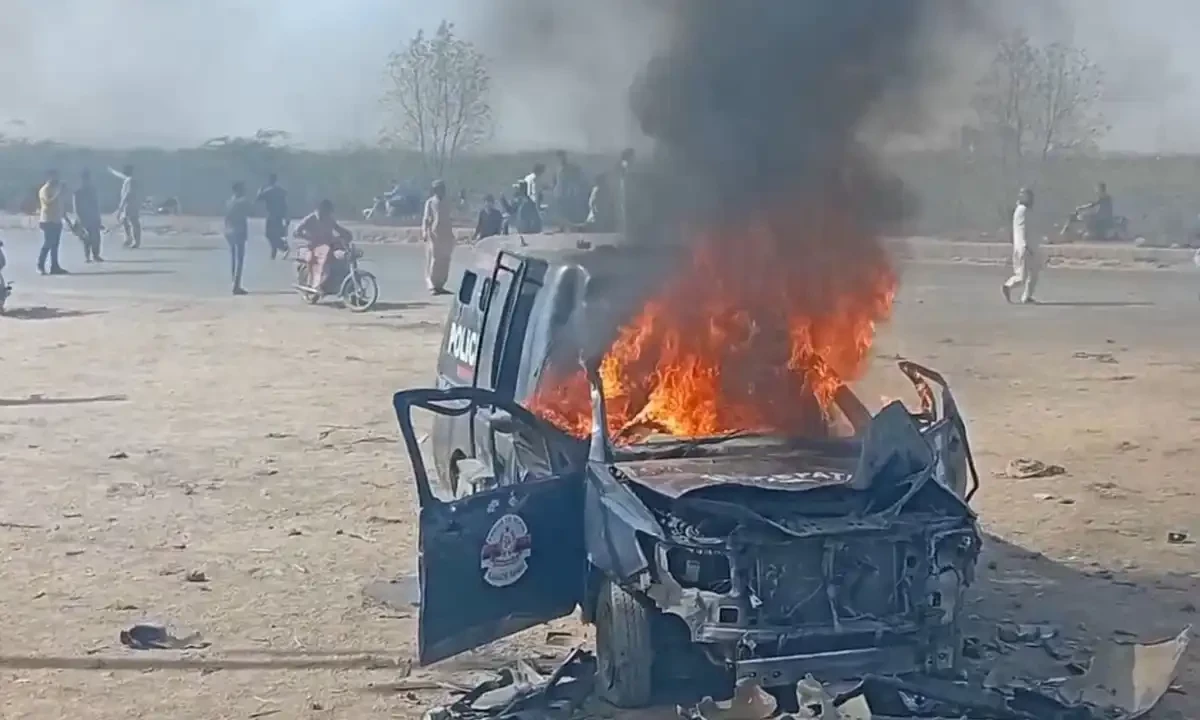 مظاہرین نے پولیس موبائل کو توڑدالا اور موبائل کے شیشے توڑ ڈالے۔ پولیس نے مظاہرین پھر لاٹھی شروع کردیا، زرائع کے مطابق پولیس نے 5 سے زائد افراد حراست میں لے لیا ہے۔