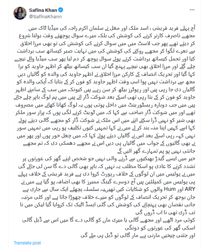 صحافی صفینہ خان نے مزید دعویٰ کیا کہ پی ٹی آئی کے حامی نہ صرف انہیں آن لائن ہراساں کر رہے ہیں بلکہ ذاتی طور پر بھی ان پر حملوں کی کوشش کی گئی ہے۔