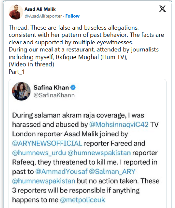 صفینہ خان کی وائرل ویڈیو اور پوسٹ کے جواب میں اسد علی ملک کا ردعمل سامنے آیا جس میں انہوں نے صفینہ خان کے الزامات کو ”جھوٹا اور بے بنیاد“ قرار دیا۔