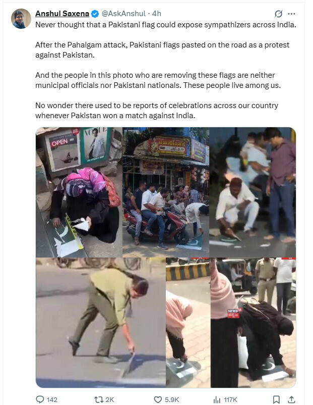 اور یہ صرف ایک خاتون نہیں، بلکہ بھارت میں متعدد ایسے واقعات دیکھنے کو ملے جہاں سڑکوں پر بے حرمتی کیلئے لگائے گئے پاکستانی پرچم کو لوگ ہٹاتے نظر آئے۔ جس سے انتہا پسندوں کے غصے کو مزید ہوا ملی۔