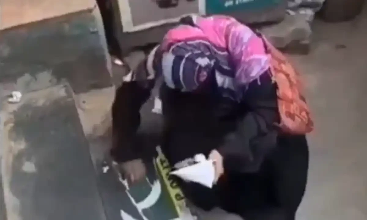 ویڈیو میں دیکھا جاسکتا ہے کہ خاتون سڑک پر چپکے پاکستان کے جھنڈے کا اسٹیکر کھرچ رہی ہیں اور بڑی بھیڑ نے انہیں گھیرا ہوا ہے۔