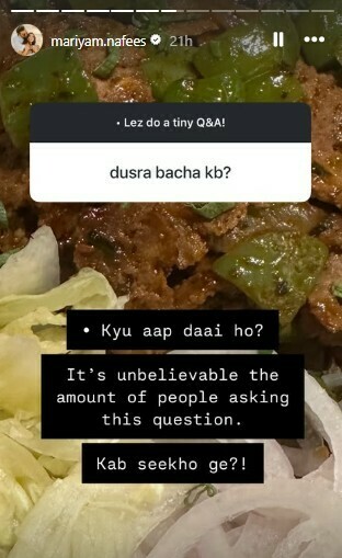 مریم نفیس، نے اپنے انسٹاگرام اکاؤنٹ پر سوال و جواب کے سیشن کا انعقاد کیا۔ اس دوران ایک صارف نے ان سے پوچھا، ”دوسرا بچہ کب؟“ جس پر مریم نفیس آگ بگولہ ہوگئیں اور غصے سے فوراجواب دیا ، ”کیوں، کیا آپ دائی ہیں؟“