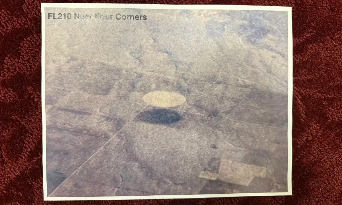 تصویر، جسے ’یو اے پی ڈسکلوزر فنڈ‘ نے سوشل میڈیا پر شیئر کیا، میں دعویٰ کیا گیا کہ ایک چمکدار، ڈسک کی شکل کا جسم 600 سے 1,000 فٹ کے قطر کے ساتھ ’فور کارنرز‘ کے علاقے کے قریب نظر آیا۔ جیسے ہی تصویر پوسٹ کی گئی، انٹرنیٹ صارفین نے فوراً اس پر تبصرے کرنا شروع کردئے اور اس تصویر کو حقیقت سے زیادہ ممکنہ طور پر دو فصلوں کے نشان یا ’کروپ سرکلز‘ قرار دیا، جبکہ کچھ نے اسے غیر مرئی قوتوں کی موجودگی سے تعبیر کیا۔