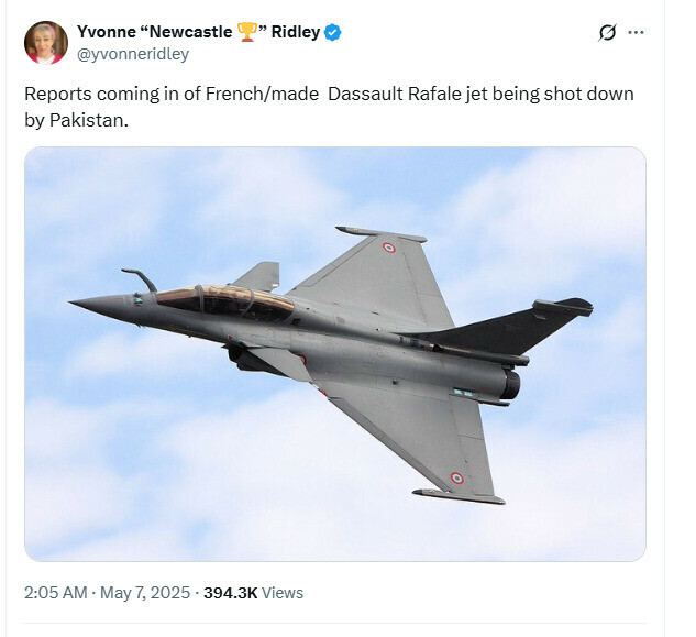 پاکستان نے بھارت کے 5 طیارے بھی مار گرائے ہیں جن میں تین رافیل شامل ہیں۔ معروف برطانوی صحافی یوان ریڈلی نے اپنی ٹوئیٹ میں کہا کہ فرانسیسی ساختہ رافیل طیارے پاکستان کی جانب سے مار گرائے جانے کی خبریں آرہی ہیں۔