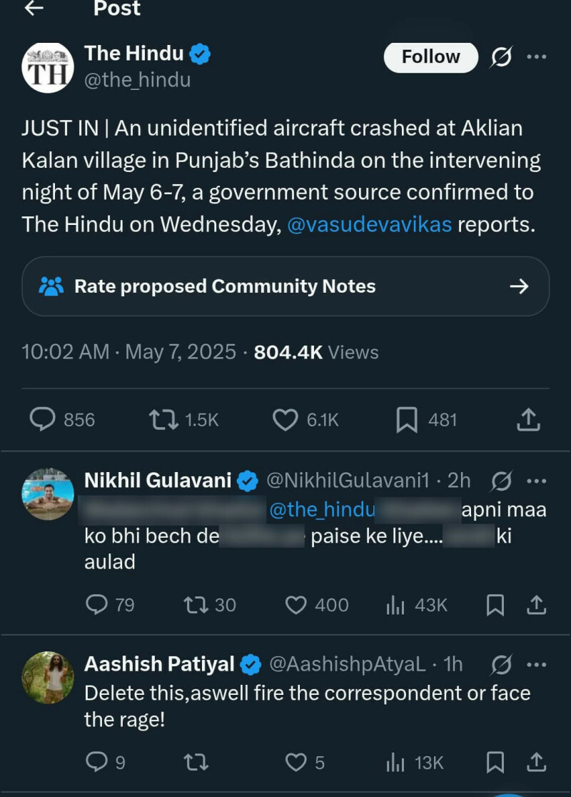 ٹوئٹر پر ایک صارف ”نکھل گلاوانی“ نے ”دی ہندو“ کو گالیوں سے نواز دیا۔