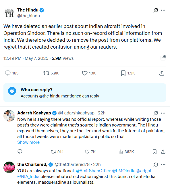 بعد ازاں بھارتی اخبار “ دی ہندو“ نے اپنے پلیٹ فارمز سے اس پوسٹ کو حذف کر دیا جس میں بھارتی طیاروں کے ”آپریشن سندور“ میں مبینہ طور پر شامل ہونے کا ذکر تھا۔