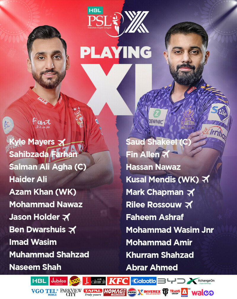 اس سے قبل اسلام آباد یونائیٹڈ نے کوئٹہ گلیڈی ایٹرز کے خلاف ٹاس جیت کر پہلے فیلڈنگ کرنے کا فیصلہ کیا۔