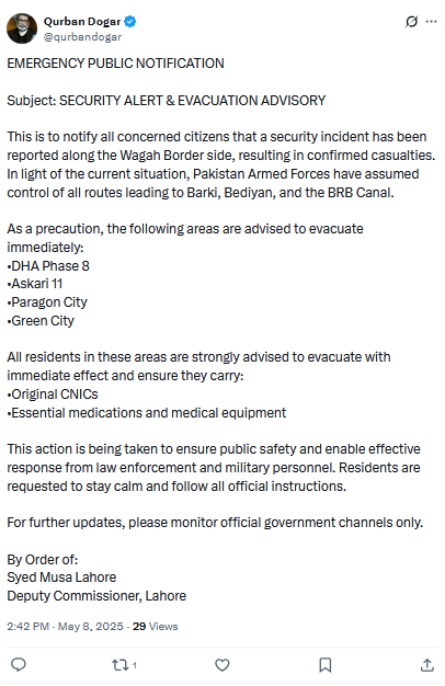مبینہ جعلی ایڈوائزری، جس پر ڈپٹی کمشنر لاہور سید موسیٰ کے دستخط دکھائے گئے، اس میں دعویٰ کیا گیا تھا کہ واہگہ بارڈر کے قریب ایک سکیورٹی واقعہ پیش آیا ہے جس میں متعدد افراد کی ہلاکت کی تصدیق ہو چکی ہے۔ ایڈوائزری کے مطابق مسلح افواج نے برکی، بیدیاں اور بی آر بی کینال کے راستوں پر کنٹرول سنبھال لیا ہے اور شہریوں کو فوری انخلاء کی ہدایت کی گئی ہے۔