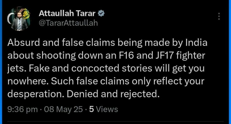وفاقی وزیر اطلاعات عطا اللہ تارڑ نے سماجی رابطے کی ویب سائٹ ایکس (سابقہ ٹوئٹر) پر بیان میں کہا ہے کہ بھارت کی جانب سے ایف 16 اور جے ایف 17 لڑاکا طیاروں کو مار گرانے کے بارے میں بے بنیاد اور جھوٹے دعوے کیے جا رہے ہیں۔