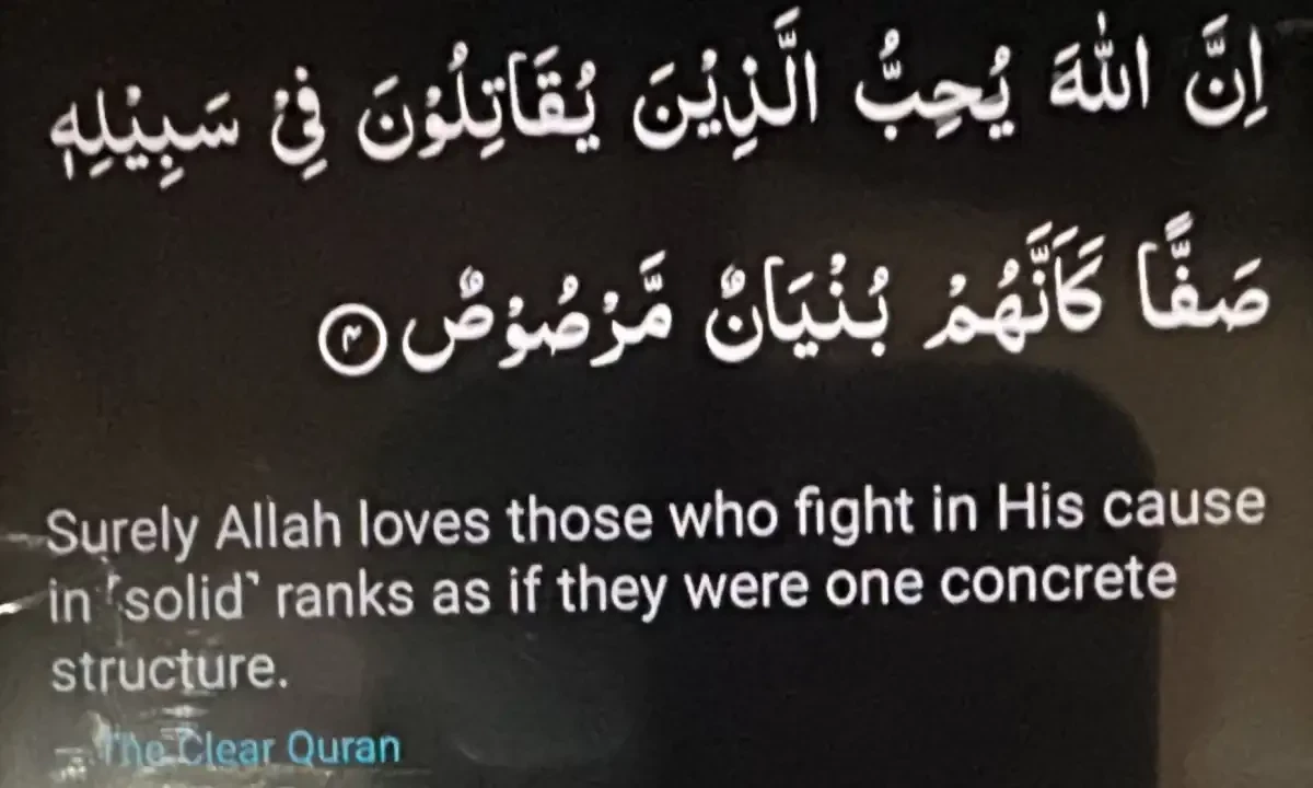 ”اِنَّ اللَّهَ يُحِبُّ الَّذِينَ يُقَاتِلُونَ فِي سَبِيلِهِ صَفًّا كَأَنَّهُمْ بُنْيَانٌ مَرْصُوصٌ“