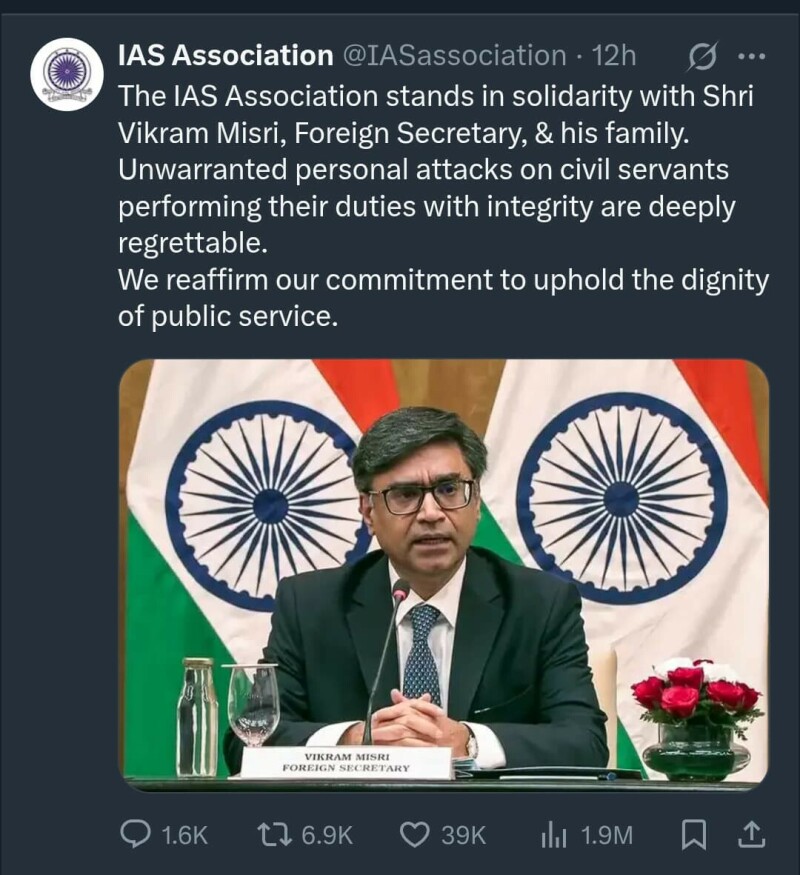 بھارتی ایڈمنسٹریٹو سروس ایسوسی ایشن نے ایکس پر جاری پوسٹ میں لکھا کہ ’آئی اے ایس ایسوسی ایشن شری وکرم مسری، سیکرٹری خارجہ، اور ان کے خاندان کے ساتھ اظہار یکجہتی کرتی ہے۔ دیانتداری کے ساتھ اپنے فرائض انجام دینے والے سرکاری افسران پر بلاجواز ذاتی حملے انتہائی قابل افسوس ہیں۔ ہم پبلک سروس کے وقار کو برقرار رکھنے کے اپنے عزم کا اعادہ کرتے ہیں۔‘