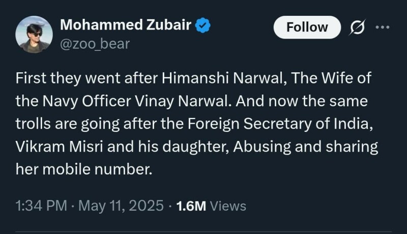 بھارتی صحافی محمد زبیر نے اس حوالے سے اپنی سوشل میڈیا پوسٹ میں بتایا کہ ’پہلے بحریہ کے افسر وِنَے نرول کی اہلیہ ہمانشی نرول کے پیچھے پڑے، اور اب وہی ٹرولز بھارت کے سیکرٹری خارجہ وکرم مسری اور ان کی بیٹی کو نشانہ بنا رہے ہیں، انہیں گالیاں دے رہے ہیں اور ان کی بیٹی کا موبائل نمبر شیئر کر رہے ہیں۔‘
