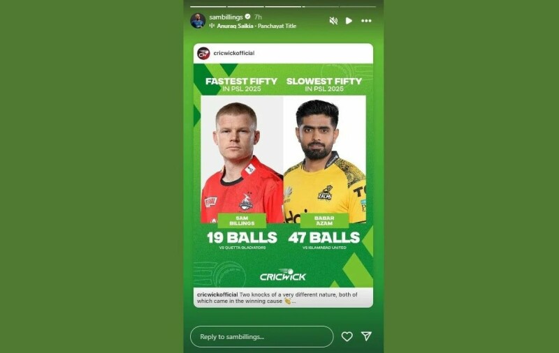 سیم بلنگز نے ایک پوسٹ شیئر کی جس میں پی ایس ایل 2025 کی تیز ترین اور سُست نصف سنچری کا ذکر کیا گیا تھا، جہاں بابراعظم نے شارٹ فارمیٹ میں 47 گیندوں پر نصف سنچری بنائی جبکہ انگلش کرکٹر نے محض 19 گیندوں میں یہ کارنامہ انجام دیا۔