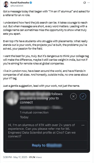 سوشل میڈیا پلیٹ فارم ایکس (سابقہ ٹوئٹر) پر وائرل ہونے والی ایک پوسٹ میں کنال نے کہا کہ ملازمت کی تلاش کرنے والے افراد کو ریفرل مانگتے وقت اپنی تعلیم کے بجائے اپنے کام، منصوبوں اور مہارت کو نمایاں کرنا چاہیے۔