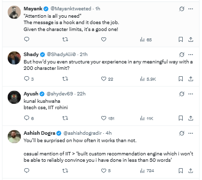لندن میں نوکری کرنے والے کنال کوشواہا نے ایک ریفرل میسج شیئر کیا جن کے الفاظ ”I’m an IIT alumnus“ (میں آئی آئی ٹی کا سابق طالب علم ہوں) سے شروع ہوئے۔ اگرچہ انہوں نے اس جرات کو سراہا کہ کوئی شخص ریفرل کے لیے خود سے رابطہ کرتا ہے، لیکن ان کا کہنا تھا کہ جب پیغامات مختصر ہوں تو ہر لفظ کی اہمیت بڑھ جاتی ہے۔