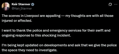 برطانوی وزیر اعظم کیئر اسٹارمر نے اس واقعے کو ”خوفناک“ قرار دیا اور کہا کہ وہ مسلسل صورتحال پر نظر رکھے ہوئے ہیں۔ سوشل میڈیا پر اپنے بیان میں انہوں نے کہا کہ لیورپول کے مناظر خوفناک ہیں، میری ہمدردیاں تمام زخمیوں اور متاثرین کے ساتھ ہیں۔ میں پولیس اور ایمرجنسی سروسز کا اس ہنگامی صورتحال میں فوری ردعمل پر شکریہ ادا کرتا ہوں۔