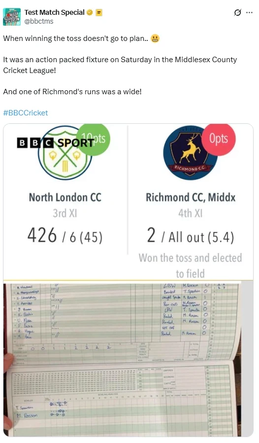 رپورٹ کے مطابق یہ ناقابلِ یقین واقعہ ہفتے کے روز مڈل سیکس کاؤنٹی لیگ کے ایک میچ میں پیش آیا، جہاں رچمنڈ کو 427 رنز کا پہاڑ جیسا ہدف درپیش تھا۔ لیکن رچمنڈ کے بلے باز صرف 5.4 اوورز میں ہی ڈھیر ہو گئے، جو کرکٹ کے اعداد و شمار کی تاریخ میں ایک نئی مثال بن گئی۔