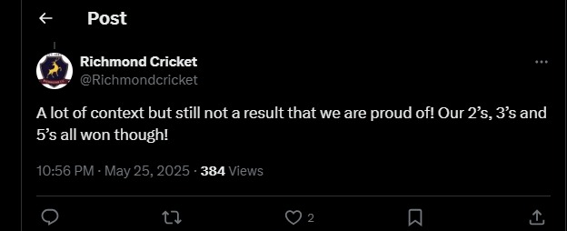 رچمنڈ کرکٹ کلب نے ایکس (پہلے ٹوئٹر) پر پوسٹ کرتے ہوئے اپنی شکست پر شرمندگی کا اظہار کیا، لیکن ساتھ ہی دیگر ٹیموں کی جیت کا ذکر کر کے کچھ عزت بچانے کی کوشش کی۔