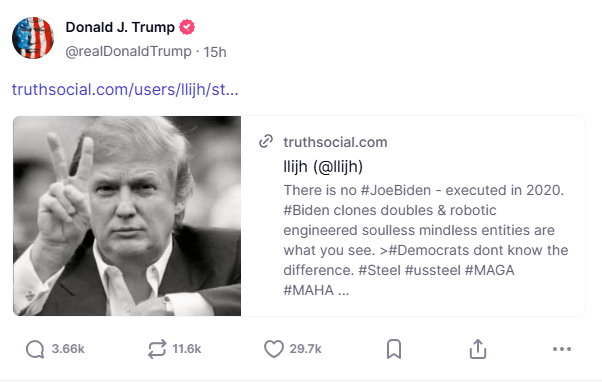 ٹرمپ نے اس پوسٹ کو بغیر کسی تبصرے کے شیئر کیا، جو ایک نایاب اقدام سمجھا جا رہا ہے کیونکہ اس میں ایک انتہائی سازشی نظریے کو فروغ دیا گیا ہے۔ پوسٹ کے اختتام پر ڈیموکریٹس کو طنزیہ انداز میں نشانہ بھی بنایا گیا۔