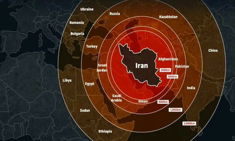 اسرائیلی فوج کی پوسٹ میں سرخ دائرے ایران سے نکلتے دکھائے گئے تھے جو بھارت، چین، سعودی عرب، لیبیا، ایتھوپیا، روس، ترکی، بلغاریہ اور رومانیہ تک پھیلتے ہیں، یہ ظاہر کرنے کے لیے کہ ایران کے میزائل کہاں تک پہنچ سکتے ہیں۔