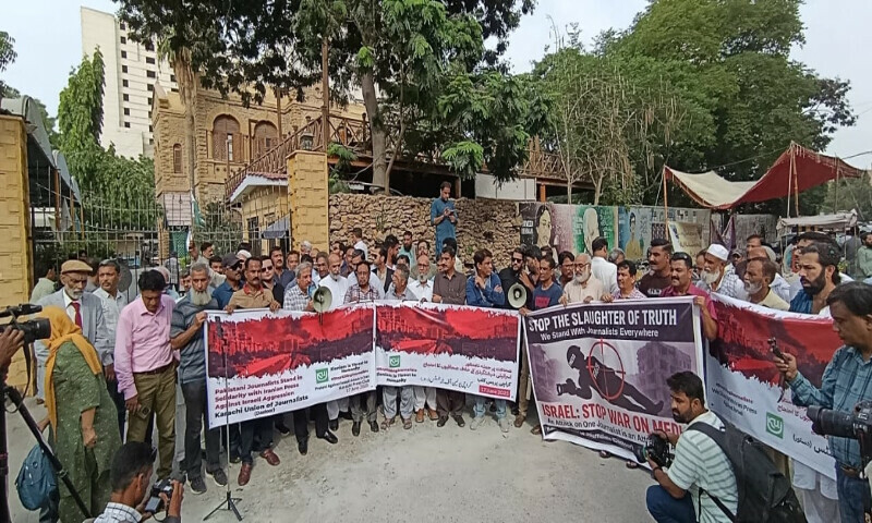 کراچی پریس کلب کے باہر صحافیوں نے اسرائیل کی جانب سے غزہ میں جاری مظالم اور ایران کے سرکاری ٹی وی کی عمارت پر حملے کی شدید مذمت کرتے ہوئے احتجاج کیا۔