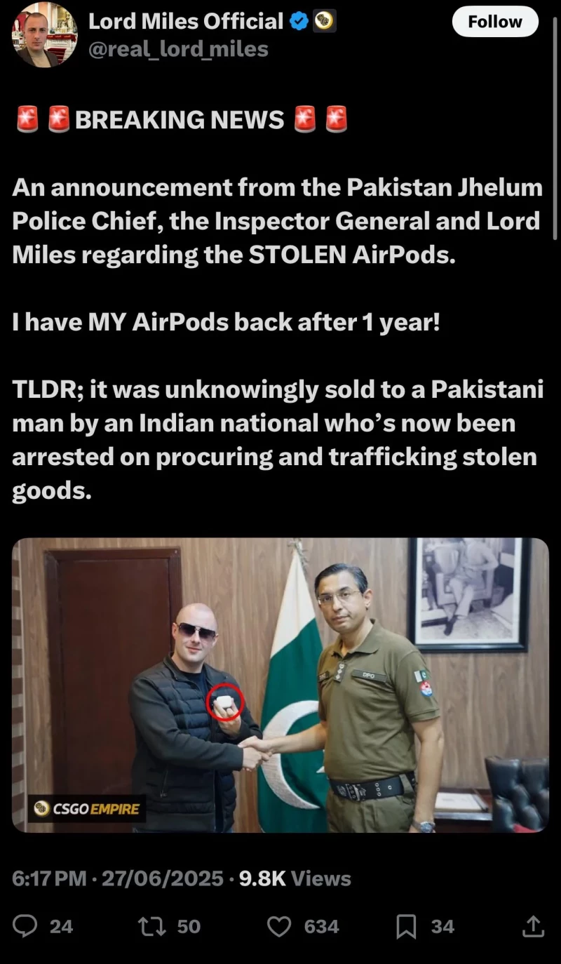 پاکستان میں کسی سے رابطہ نہ ہونے کی صورت میں، لارڈ مائلز نے سوشل میڈیا کا سہارا لیا، جہلم پولیس کو ٹیگ کرتے ہوئے ایئر پوڈز کی لوکیشن شیئر کی اور مدد کی درخواست کی۔