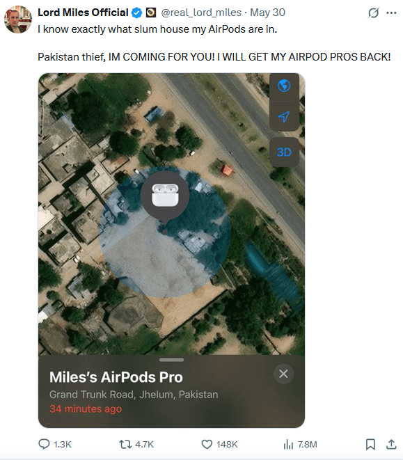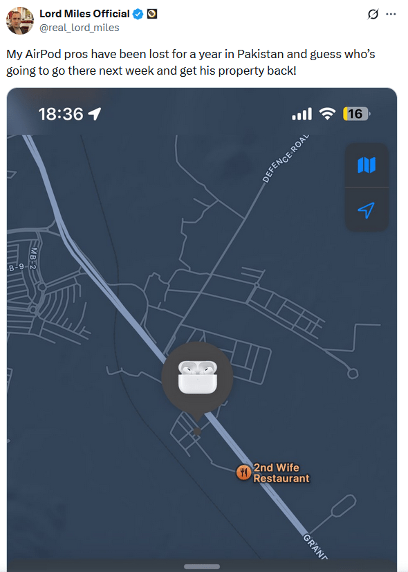 ’لارڈ مائلز‘ کے ائیر پوڈز کا دلچسپ واقعہ کچھ ہفتے قبل سوشل میڈیا پر سامنے آیا اور لارڈ مائلز نے اعلان کیا کہ ان کے چوری شدہ ایئرپوڈز پاکستان میں ہیں اور وہ خود ان کو واپس لینے کے لیے پاکستان آئیں گے۔