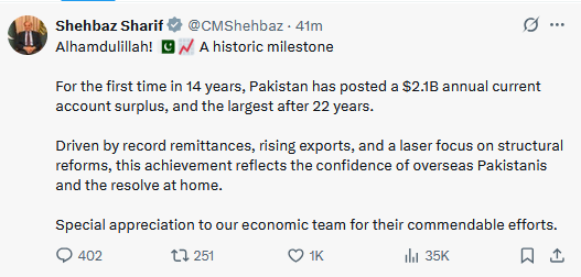 وزیراعظم نے کہا: ”الحمدللہ! یہ کارنامہ ریکارڈ ترسیلات زر، برآمدات میں اضافے اور معیشت میں اصلاحات پر مسلسل توجہ کے نتیجے میں حاصل ہوا ہے، جو نہ صرف سمندر پار پاکستانیوں کے اعتماد کی عکاسی کرتا ہے بلکہ ملک میں موجود معاشی ٹیم کے عزم و حوصلے کو بھی ظاہر کرتا ہے۔“
