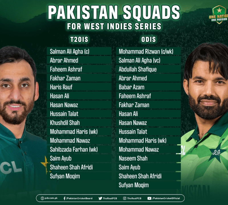 دورہ ویسٹ انڈیز کیلئے پاکستان کے ٹی ٹوئنٹی اور ون ڈے اسکواڈ کا اعلان کر دیا گیا۔