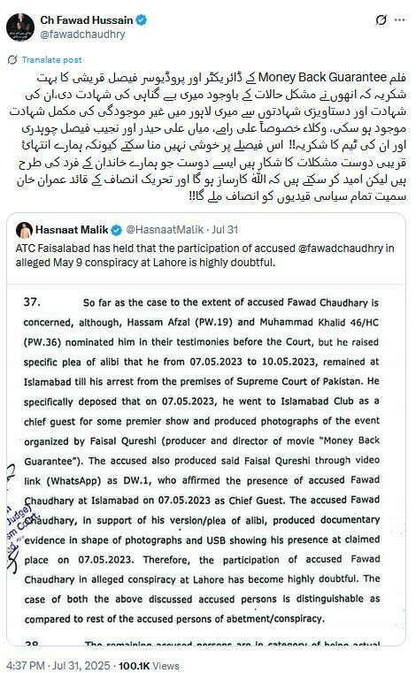 فواد چوہدری کی خوش نصیبی کی وجہ بنی ایک فلم۔ جی ہاں، فیصل قریشی کی فلم ”منی بیک گارنٹی“ کا لاہور میں ہونے والا پریمئر، جس میں فواد چوہدری ”چیف گیسٹ“ تھے۔ عدالت نے فلم کے ڈائریکٹر اور پروڈیوسر فیصل قریشی کی گواہی اور دیگر شواہد کی بنیاد پر تسلیم کیا کہ فواد چوہدری واقعے کے وقت موقع پر موجود ہی نہیں تھے، اس لیے انہیں مقدمے سے بری کر دیا گیا۔