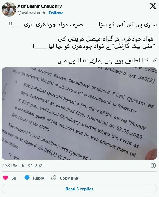 آصف بشیر چوہدری نے لکھا، ’ساری پی ٹی آئی کو سزا، صرف فواد چوہدری بری، اور وہ بھی فلم کی گواہی پر؟‘