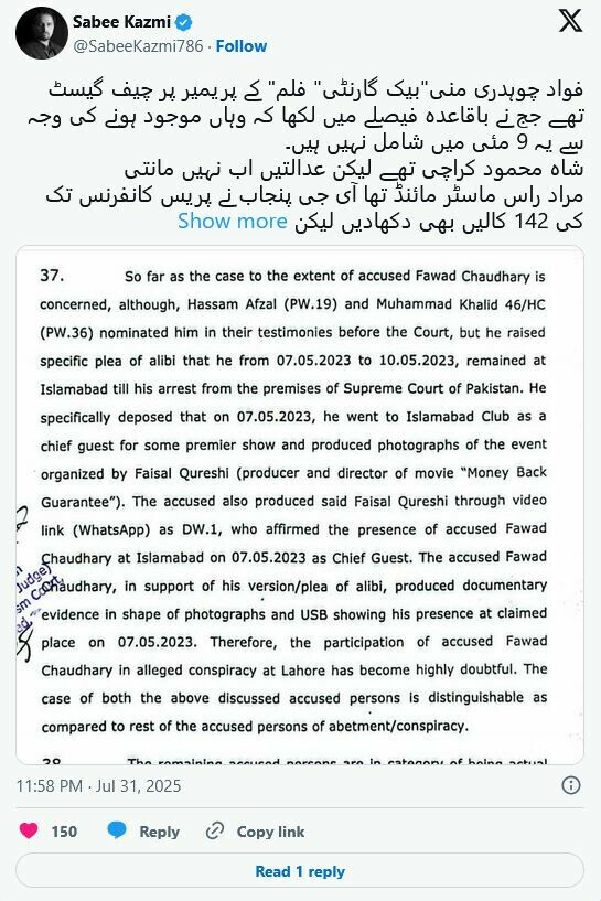 سبی کاظمی نے یاد دلایا کہ ’شاہ محمود قریشی کراچی میں تھے، مگر عدالتیں نہیں مانیں۔ مراد راس ماسٹر مائنڈ قرار پایا۔ مگر فواد چوہدری فلم دیکھ رہے تھے، سو بری ہوگئے۔‘
