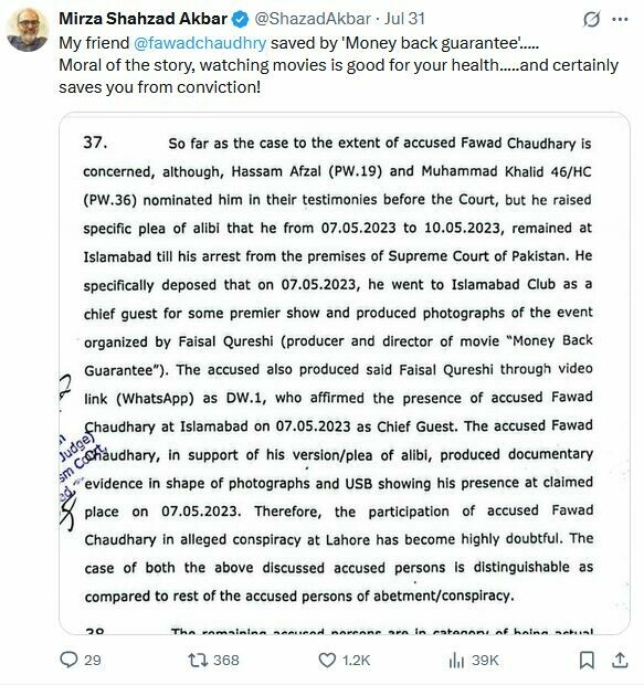پاکستان کی سیاست اور عدالتی نظام میں ایک اور انوکھا موڑ اُس وقت آیا جب سابق وفاقی وزیر فواد چوہدری کو 9 مئی کے ہنگامہ خیز کیس میں صرف اس لیے بری کر دیا گیا کیونکہ وہ اُس دن فلم ”منی بیک گارنٹی“ کے پریمئر میں موجود تھے۔