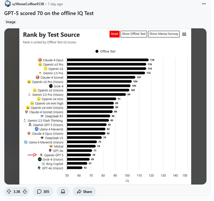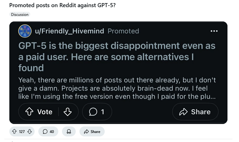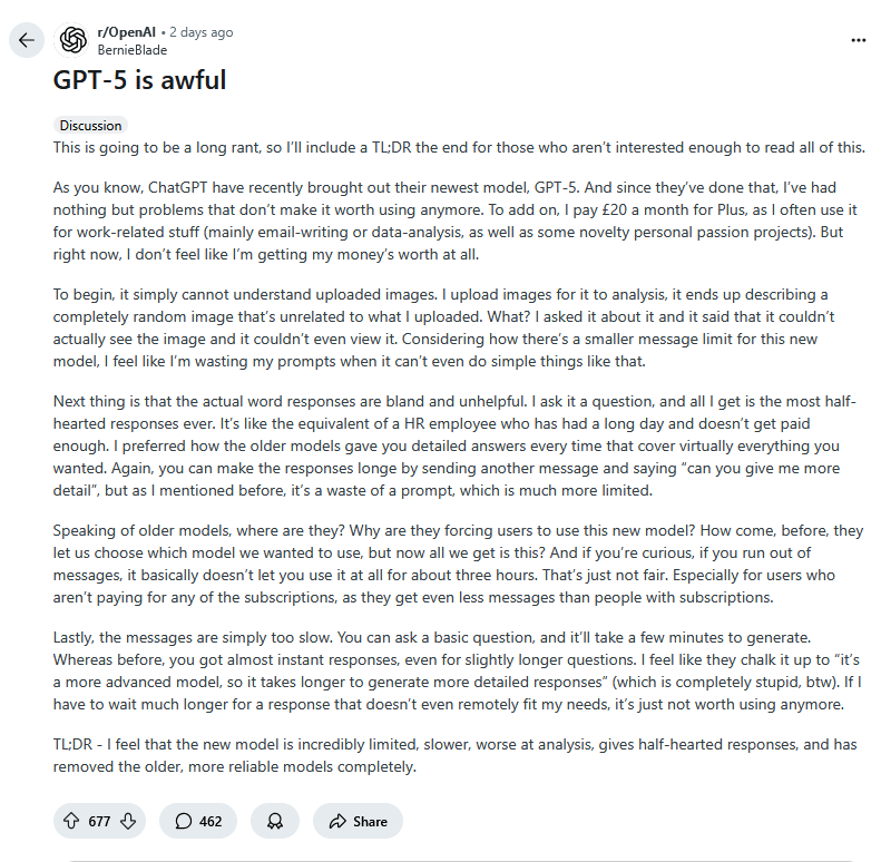 اس وقت سب سے زیادہ ووٹ حاصل کرنے والی پوسٹوں میں سے جی پی ٹی 5 ریڈٹ پر ایک پوسٹ میں لکھا ہے، ’جی پی ٹی-5 انتہائی ناقص ہے۔‘