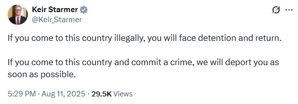 میڈیا رپورٹس کے مطابق برطانیہ کے وزیراعظم کیئر اسٹارمر نے پیر کے روز سوشل میڈیا پلیٹ فارم ایکس پر غیر قانونی طور پر ملک میں داخل ہونے والے تارکین وطن کو سخت پیغام جاری کیا ہے۔