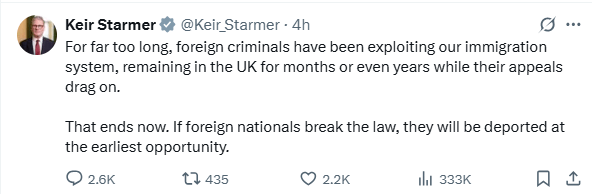 اپنے پیغام میں کیئر اسٹارمر نے کہا کہ ایسے افراد کو فوری طور پر حراست میں لیا جائے گا اور ملک سے نکال دیا جائے گا۔ یہ بیان برطانیہ کی امیگریشن پالیسی میں اصلاحات کے تحت ”ڈی پورٹ ناؤ، اپیل لیٹر“ اسکیم کو 23 ممالک تک وسعت دینے کے پس منظر میں سامنے آیا ہے۔ اس فہرست میں بھارت بھی شامل ہے۔