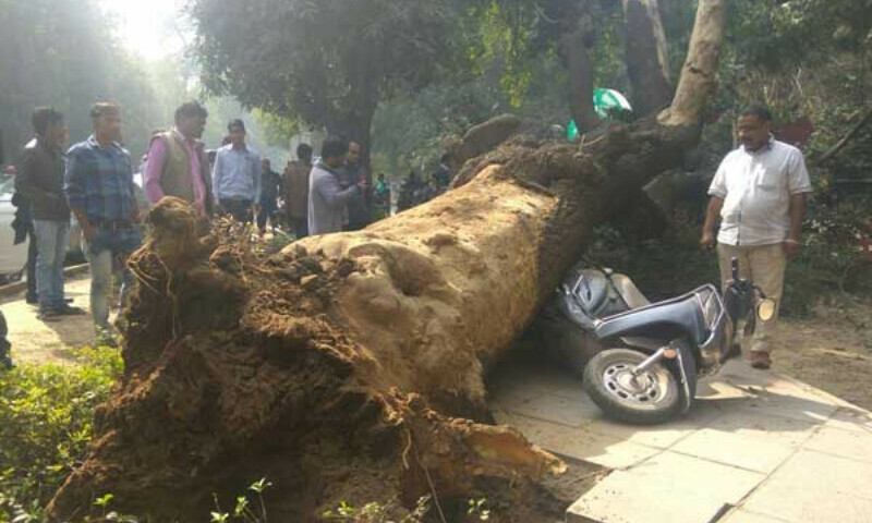 نئی دہلی کے علاقے کالکاجی میں گزشتہ روز طوفانی بارشوں کے دوران ایک پرانا نیم کا درخت شدید ہواؤں کا مقابلہ نہ کرتے ہوئے جڑ سے اکھڑ کر سڑک پر آ گرا۔ درخت کا تنا ایک موٹر سائیکل پر گر گیا، جس پر 50 سالہ سدھیر کمار اور ان کی 22 سالہ بیٹی پرنیا سوار تھے۔