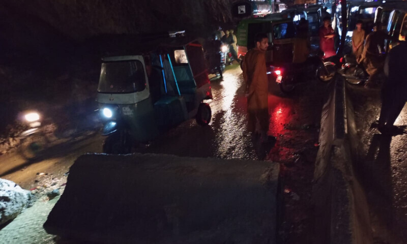 بارش کے باعث کٹی پہاڑی کے تودے سڑک پر گرگئے، جس کے باعث شہری جانی نقصان سے بال بال بچ گئے تاہم سڑک پر پہاڑی پتھر گرنے سے ٹریفک جام ہوگیا۔