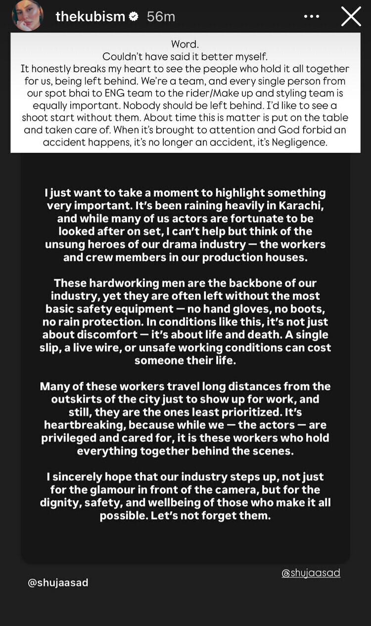 شجاع نے انسٹاگرام پر ایک جذباتی پوسٹ میں ان لوگوں کی حالت زار پر تشویش کا اظہار کیا جو دن رات، بارش ہو یا گرمی، شوٹنگز کو ممکن بنانے میں اہم کردار ادا کرتے ہیں۔