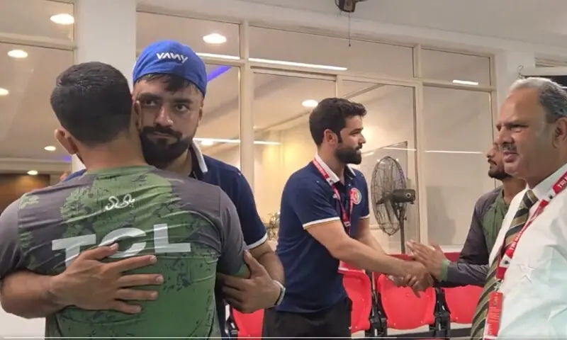 پاکستان کرکٹ بورڈ کی جانب سے جاری ویڈیو میں دیکھا جا سکتا ہے کہ قومی کھلاڑی اور ٹیم منیجر راشد خان کو گلے لگا کر دلاسہ دے رہے ہیں۔