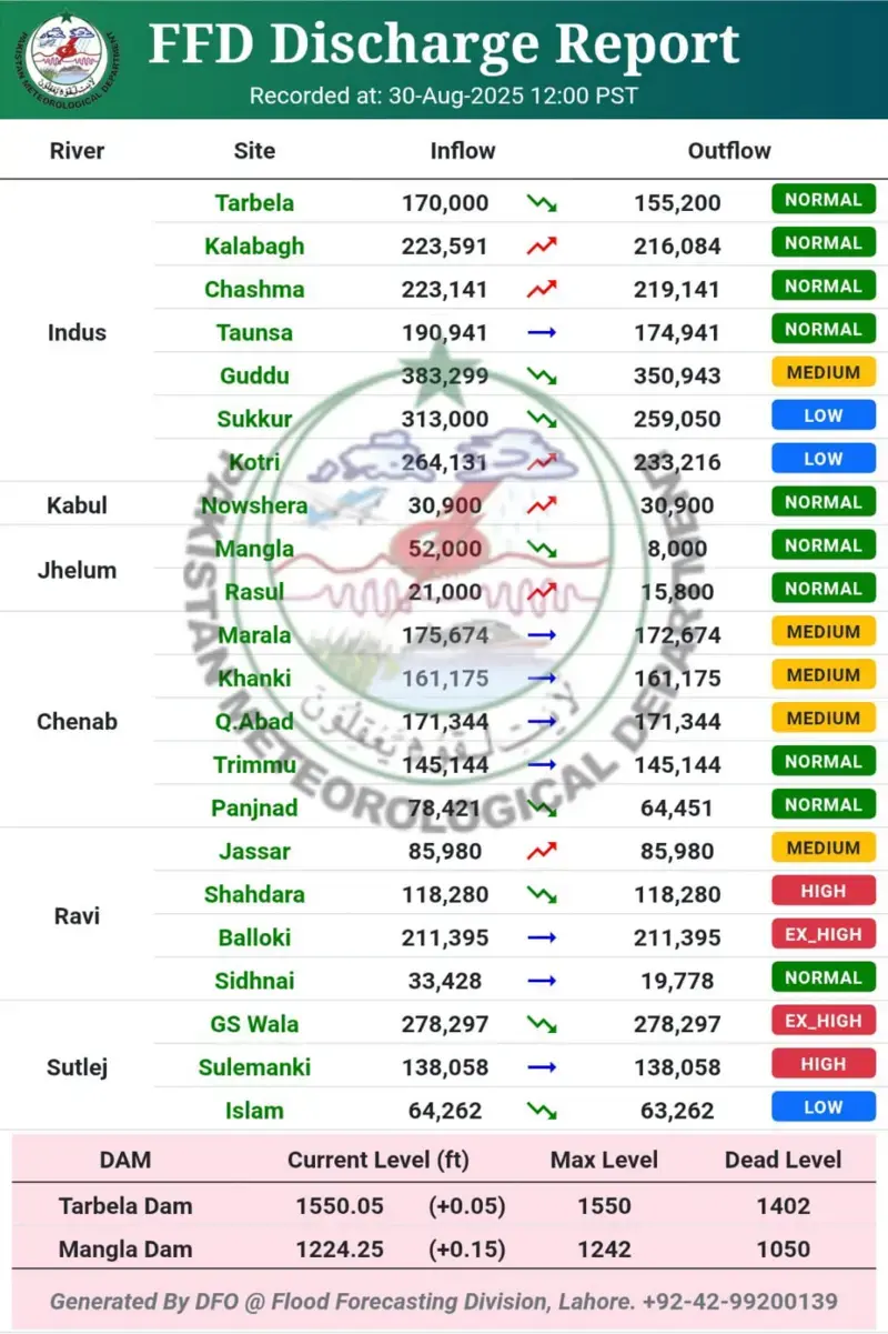 انڈس: تربیلا ڈیم میں پانی کی آمد 170,000 کیوسک اور اخراج 155,200 کیوسک ہے اور سطح نارمل ہے۔ کالا باغ، چشمہ اور تونسہ میں بھی پانی کا بہاؤ معمول کے مطابق ہے۔ گڈو بیراج میں درمیانے درجے کا سیلاب جبکہ سکھر اور کوٹری میں کم سطح رپورٹ ہوئی ہے۔