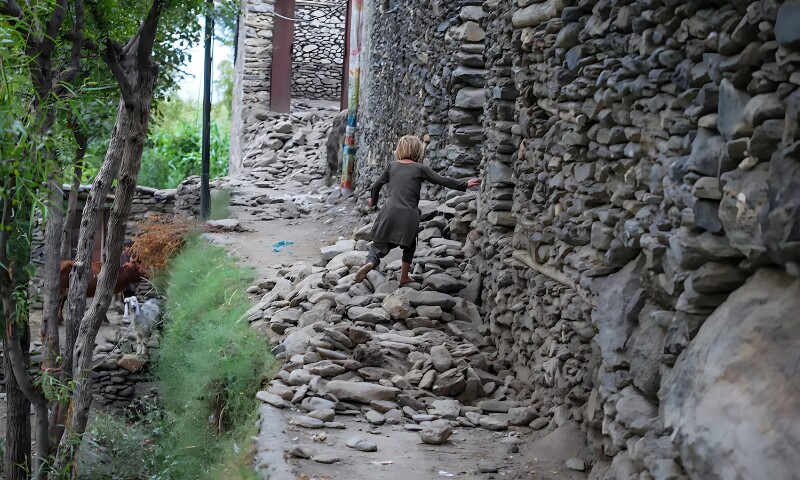 افغان بچی زلزلے میں تباہ دیوار کے ملبے پر چلتے ہوئے