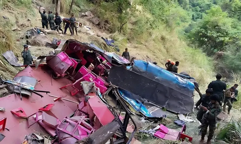 ڈرائیور کے کنٹرول کھونے کے بعد بس پہلے ایک اور گاڑی اور سڑک کے حفاظتی جنگلے سے ٹکرائی، پھر گہری کھائی میں جا گری۔